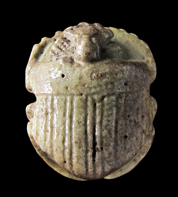 Scarabeo zoomorfo in faience verde. Dorso con clipeo e lavorazione ondulata sulla testa, visibile anche dal ventre; elitre non separate, con zigrinature verticali. Ventre con le zampe ripiegate ed una piccola presa trasversale al centro.