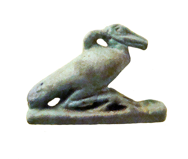 Amuleto in faience lavorato a tutto tondo, raffigurante un ibis (animale sacro al dio Thot), caratterizzato dal lungo becco a falce lunare e dal grosso corpo; le zampe poggiano su una piccola base; dietro il collo vi è un anello di sospensione.