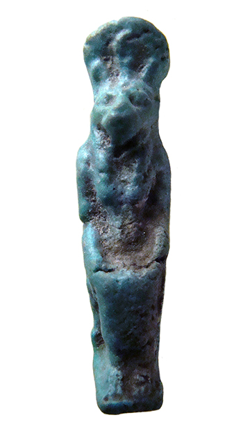 Amuleto in faience che raffigura la dea Sekhmet. L’iconografia è quella consueta, di donna con testa di leonessa. La dea è seduta su un trono a basso schienale, di semplice forma cubica; indossa una lunga veste aderente e le mani, strette a pugno, sono poggiate sulle cosce: la posa è la stessa delle grandi statue della dea ritrovate in gran numero presso il tempio di Mut a Karnak. I piedi poggiano su una sottile base, che forma un tutt’uno con il trono e con il pilastro dorsale sul dorso.