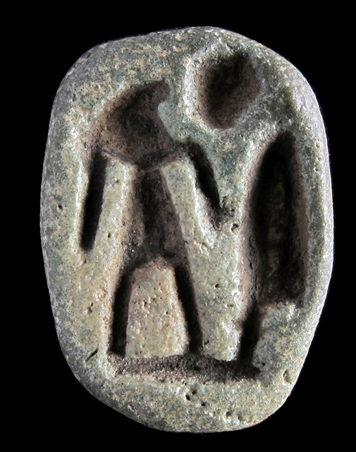 Scaraboide in faience con sul ventre rappresentazione di divinità con disco solare e piuma. Dorso con incisione di una scimmia che suona uno strumento a fiato, con un elemento decorativo vegetale davanti (capovolto rispetto alla decorazione del ventre). Il colore originale doveva essere azzurro. Foro passante longitudinale.