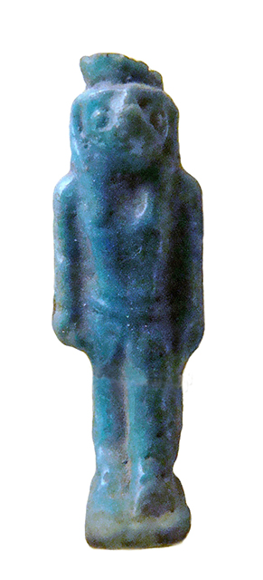 Amuleto in faience raffigurante Horo con pilastro dorsale e foro sulla testa, dall'Egitto