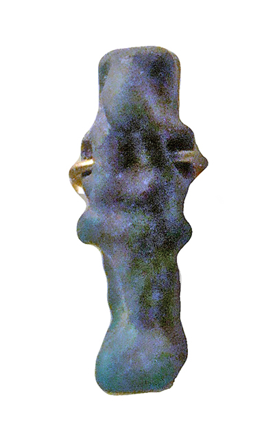 Amuleto in faience che raffigura il dio Thot, dio della sapienza e inventore dei geroglifici. In modo più che schematico, il dio è raffigurato in piedi, nell'atto di camminare (ha la gamba sinistra in avanti); la testa è quella dell'ibis, suo animale sacro, caratterizzata dal lungo becco a forma di falce lunare (non particolarmente accentuato), con una parrucca che scende sul petto; le braccia sono stese lungo il corpo, con le mani chiuse a pugno; indossa un corto gonnellino. I piedi poggiano su una base parallelepideda, che dietro si sviluppa nel pilastro dorsale. C'è un foro passante ricavato all'altezza delle spalle.