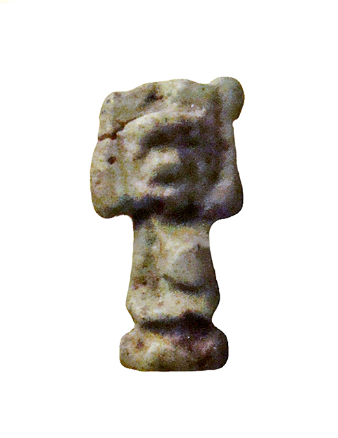Amuleto in faience, alquanto stilizzato, raffigurante il dio dell'aria Shu. Il dio è raffigurato inginocchiato, con indosso un gonnellino e con le braccia alzate simmetricamente a reggere un disco solare sopra il capo. I piedi poggiano su una piccola base parallelepipeda, che dietro si sviluppa nel pilastro dorsale, forato per permettere la sospensione dell'amuleto.