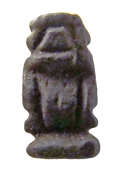 Amuleto in faience raffigurante la divinità apotropaica Bes. Il dio è raffigurato nel suo aspetto consueto, anche se in modo molto stilizzato: con il corpo tozzo e le gambe arcuate, le braccia appoggiate sulle cosce, il volto frontale con le orecchie sporgenti, le sopracciglia evidenziate, la barba e il grande naso piatto. Sul capo manca la corona di piume di struzzo, spezzata in antico, mentre i piedi poggiano su una piccola base quadrangolare.
