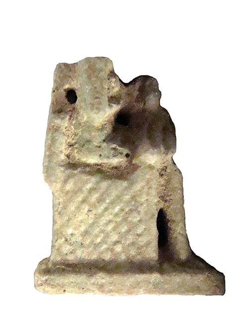 Amuleto in faience raffigurante Iside seduta su un trono a basso schienale, raffigurata nell’atto di allattare il figlioletto Horus, disteso sulle sue ginocchia. I piedi poggiano su una piccola base ed è presente un foro all'altezza della schiena. Purtroppo la testa della dea è spezzata.