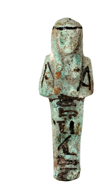 Statuina funeraria mummiforme che indossa la parrucca tripartita con il seshed. Le braccia sono incrociate sul petto, la destra sulla sinistra, e le mani reggono entrambe una zappa. Sulla schiena è sospesa una sacca per sementi. Sotto le braccia parte la colonna di iscrizione. Tutti i dettagli sono resi con dipintura in nero.