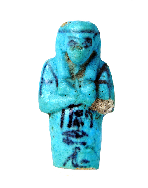 Frammento superiore di statuina funeraria mummiforme che indossa la parrucca tripartita con il seshed. Le braccia sono incrociate sul petto, la destra sulla sinistra, e le mani reggono entrambe una zappa. Sulla schiena pende una sacca per sementi. Sotto le braccia parte la colonna di iscrizione, purtroppo mutila a causa della frattura. Tutti i dettagli sono resi con dipintura in nero.