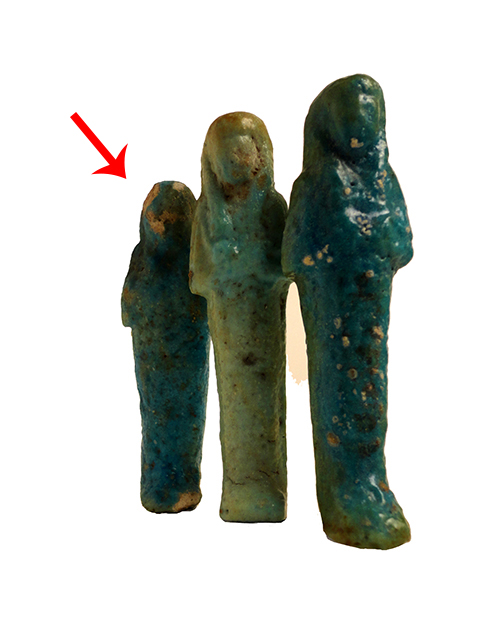 Statuina funeraria mummiforme che indossa una gonfia parrucca tripartita. Le braccia sono incrociate e reggono attrezzi non identificabili; pilastro dorsale e base sono assenti. L’ushabti è privo di iscrizioni.