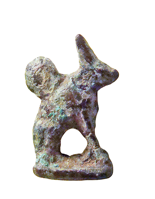 Amuleto in faience lavorato a tutto tondo con numerose incrostazioni superficiali che rendono difficile la determinazione precisa del materiale. Raffigura un gatto dalle grandi orecchie seduto su una piccola base; sul dorso vi è un anello di sospensione.
