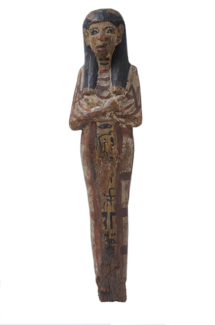 Statuina funeraria mummiforme dipinta in bianco, i dettagli sono stati aggiunti in rosso scuro, blu e nero. Indossa un collare rosso ed una parrucca tripartita nera, con le tre ciocche chiuse da fermagli dipinti in giallo. Le braccia sono incrociate e le mani tengono ognuna una zappa disegnata in rosso. Al centro della schiena vi è una sacca trapezoidale rossa, tenuta da due bretelle, e forse un sacchetto per semi dietro la spalla destra. Le gambe sono decorate con un motivo di bande rosse e blu, imitanti la fasciatura delle mummie dell’epoca. I piedi sono mancanti. L’iscrizione, dipinta in nero, è disposta su una colonna che si legge da destra a sinistra e che è inserita in un pannello ocra con contorni rossi, sul davanti delle gambe.