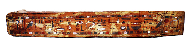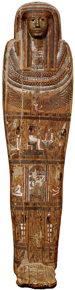 Coperchio del sarcofago Il coperchio antropoide presenta un volto dai tratti ben modellati, circondato da una parrucca a fasce longitudinali, che ricade con due bande sul petto. Sulla sommità del capo è raffigurato uno scarabeo nero con le ali aperte e allargate, fiancheggiato dal geroglifico della benda ripiegata, sormontata a destra dal segno dell’Oriente e a sinistra dalla piuma simbolo dell’Occidente. Il petto è ricoperto dal collare-usekh e da cinque registri con scene e testi, che mostrano (dall'alto): - La dea Nut ad ali spiegate, chiamata nelle brevi iscrizioni geroglifiche accanto alla testa "signora dell’Occidente" e "signora della Duat"; - Il dio Osiride, seduto su trono a basso schienale, con alle spalle la dea Iside, a cui si rivolge il dio Horo, che introduce il defunto, stante alle sue spalle. Tra i due dei, un fiore di loto sorregge i quattro geni funerari (i figli di Horo). Chiude la scena, all’estremità sinistra, su alto supporto, la dea Uto alata a testa leonina e coda di serpente, con disco solare sul capo e tra le ali il simbolo udjat. I geroglifici riportano i nomi dei personaggi raffigurati; - Al centro, in un naos (o tempietto, in forma dell’antico santuario del Basso Egitto) su un alto supporto, è posta la barca celeste Henu con un grande flabello a prua e la poppa a testa d’orice. Sulla barca naviga il Sole, in forma di falco, con il quale il defunto si identifica. A sinistra, la dea Neith inginocchiata protende le braccia flesse verso la barca, mentre dietro ha lo scettro-sekhem; in posizione simmetrica dall'altro lato, la dea scorpione Selkis, con alle spalle il geroglifico dell’Occidente. I due brevi testi accanto alle dee indicano l'azione da esse compiuta: "proteggere Pa-sen-en-hor"; - Due colonne di testo al centro (che coprono anche il rialzo dei piedi) dividono il quarto registro: a sinistra vi è una scena con il dio Horo che unge il defunto mummiforme (accompagnato da due brevi iscrizioni "Horus figlio di Iside e di Osiride" sotto la scena e "Proteggere Pa-sen-en-hor alle spalle del dio); a destra la scena è simmetrica, ma con il dio Anubi (identificato grazie all'iscrizione sotto la scena, che recita "Anubi, signore della terra sacra, preposto alla tenda dell'imbalsamazione"); - Sul rialzo dei piedi, ai lati delle colonne del testo, due emblemi dell’Occidente. Cassa del sarcofago Sui lati esterni della cassa vi sono due uniche righe di iscrizione in bei caratteri geroglifici, mentre all'interno il fondo della cassa è occupato per circa due terzi dalla figura della dea Nut, ritta, vista frontalmente. La dea ha braccia aperte, flesse verso l’alto, protese sui lati della cassa, e in ciascuna mano tiene il segno della vita. Porta sul capo ampia parrucca dipinta in verde, le cui bande anteriori le incorniciano il volto, disegnato frontalmente. Vicino al corpo della dea, a sinistra, si scorgono tracce di segni geroglifici, purtroppo illeggibili. All’altezza del capo, la dea è fiancheggiata, a destra dal falcone Harakhti (= Horo dell’Orizzonte) e a sinistra da un airone, sui quali sono alcuni geroglifici e il segno della vita; ambedue gli uccelli stanno sul geroglifico dell’Occidente, e sono dipinti in verde, col piumaggio nero e bianco. Sopra la dea Nut, e separato da questa da due fasce verde scuro (quella inferiore con una serie di stelle affiancate, ideogramma del cielo stellato, quella superiore a segmentini verde chiaro) si erge il pilastro djed sormontato dal disco solare, e fiancheggiato da due dee, molto probabilmente Iside e Nefti. La zona davanti all’altra dea e quella soprastante il disco solare in corrispondenza all’appoggio della testa del defunto, invece, sono fortemente impregnate di bitume.
