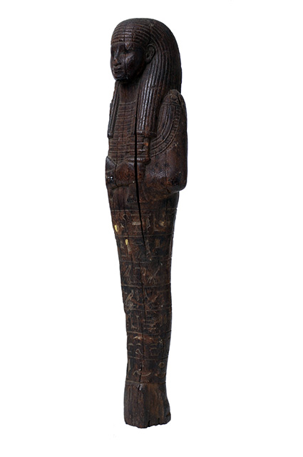 Statuina funeraria mummiforme, di cui purtroppo mancano tutta la parte destra e i piedi, è di finissima fattura ed i dettagli sono resi con molta precisione. Indossa una parrucca tripartita striata ed un collare, alla cui estremità si riconosce il fermaglio a testa di falco. Le braccia sono incrociate, la destra sopra la sinistra; la mano sinistra tiene un ged. L’iscrizione, ben leggibile nella porzione conservata, si sviluppa su sette righe attorno alle gambe, che riportano il capitolo 6 del Libro dei Morti e il nome e i titoli del defunto.