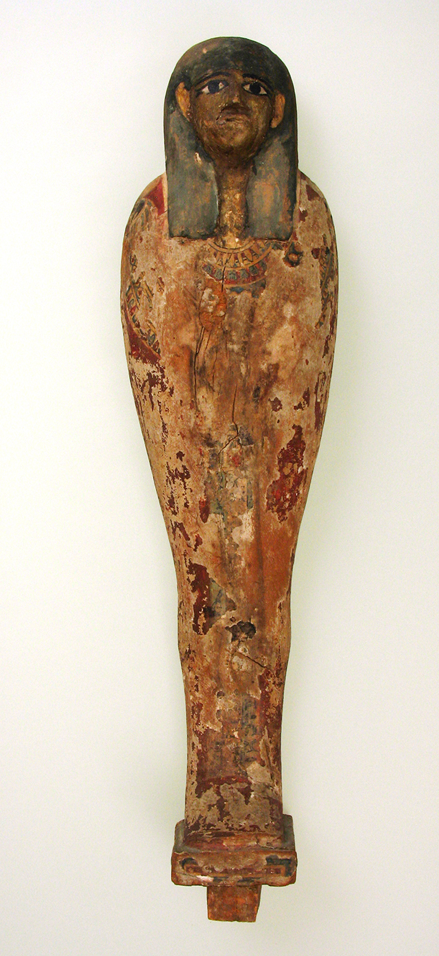Della statua di Ptah-Sokar-Osiride rimane solo la grande figura mummiforme completamente avvolta nelle bende, con retro piatto. Emerge il volto dominato dalla parrucca di capelli scuri, che ricadono in tre bande (due sul petto e una dietro le spalle). Sopra il capo si conserva parte del perno per l’applicazione della corona, che doveva essere anch’essa lignea, formata da due piume di struzzo con disco solare, poste su corna d’ariete orizzontali ondulate a manubrio, ora purtroppo perduta. Sul petto reca dipinta una ampia collana usekh, con elementi a forma di fiore di loto e chiusure raffiguranti teste di falco (immagine del dio Sokar) con disco solare ed ureo. Il resto del corpo era dipinto di rosso. Sul retro, in corrispondenza della parrucca, rimane un incavo di forma rettangolare profondo poco meno di tre centimetri, in cui era inserito con ogni probabilità un Osiride vegetante. Un’iscrizione è dipinta sul davanti, dalla collana in giù, molto deteriorata. Si intuisce ancora che essa constava di tre colonne, ma solo qualche segno resta ancora riconoscibile. Alla fine della colonna destra si legge tra lacune “… Iside la grande…”. Sul retro della statua vi erano soltanto due colonne di testo, conservate per circa metà della loro altezza (vedi trascrizione). Tali simulacri rappresentano il defunto, identificato nella divinità sincretica derivata dall’associazione di Ptah, Sokar e Osiride ed erano destinati a garantire la rinascita dopo la morte.