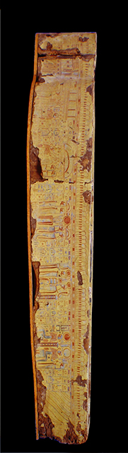 La moltitudine delle immagini, distribuite in vignette alternate a colonne di geroglifici, così come i testi stessi, ripropongono il culto del dio Osiride e del sole, affermando l’idea del viaggio eterno dell’astro, a cui la defunta partecipa essendo ella stessa una parte del grande dio. Puntuali confronti con sarcofagi custoditi presso il Museo nazionale di Napoli, il British Museum e il Petrie Museum di Londra, evidenziano la sua appartenenza al gruppo dei cosiddetti “yellow coffins”, datato alla fine della XXI dinastia e in uso particolarmente nell’ambito della casta sacerdotale di Amon a Tebe. Si tratta di un sarcofago femminile, come è dimostrato dai seni, riconoscibili sotto le bande della parrucca, dalla particolare lunghezza di queste ultime, dal fatto che le orecchie non sono visibili e dal colore del volto. I testi geroglifici della cassa non riportano il suo nome (a meno che non si trovasse nella porzione ormai illeggibile del testo del coperchio) e questa circostanza, riscontrata anche in altri esemplari simili, risulta essere un’altra caratteristica della fine della XXI dinastia. La proprietaria fu probabilmente una sacerdotessa di Amon vissuta nella zona tebana.