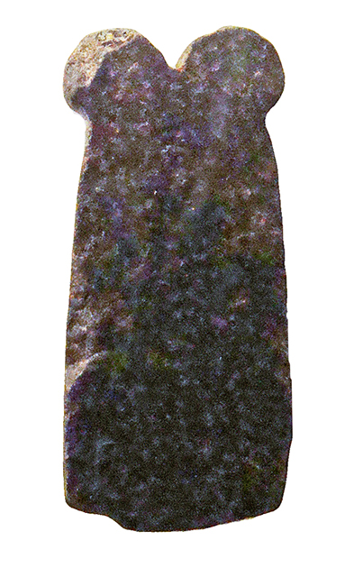 Amuleto in pietra, bidimensionale, che raffigura la silhouette di una coppia di piume di struzzo disposte simmetricamente e riconoscibili per la sommità tondeggiante e rigonfia, mentre la base è insolitamente diritta. L'amuleto è privo di foro per la sospensione. La piuma di struzzo singola era l'emblema della dea Maat, garante della verità e della giustizia.