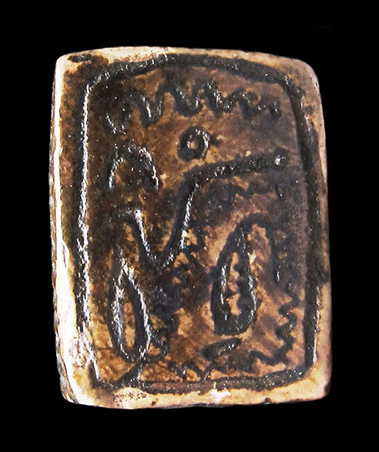 Piastra rettangolare in steatite marrone; su entrambe le facce sono presenti incisioni di segni geroglifici stilizzati, disposti senza un ordine apparente, il che non ne consente la lettura. Sono presenti delle serpentine come riempitivo. Foro passante longitudinale. Autenticità dubbia.