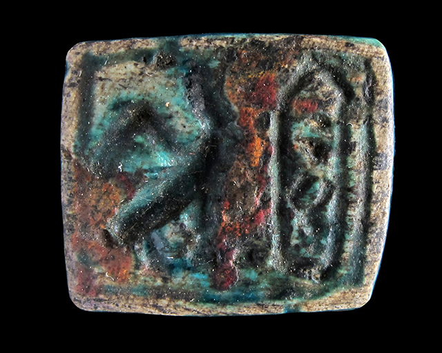 Piastra rettangolare in steatite invetriata turchese; Su una faccia sono presenti un cartiglio indecifrabile disposto verticalmente ed un falco con corona e flagello. Sull’altra, forse un animale (non ben visibile a causa della scheggiatura dell’angolo) ed alcuni segni. Foro passante longitudinale.