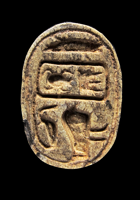 Scarabeo in steatite marrone; sul ventre, sotto un segno neb rovesciato si vede uno pseudo cartiglio imitante quelli col prenome di Thutmosi III in disposizione orizzontale, dal quale pende a sinistra un ureo. Davanti a questo vi è un falco molto stilizzato disposto perpendicolarmente rispetto al resto della decorazione. Dorso con clipeo; protorace ed elitre separati da incisione a T. Foro passante longitudinale.