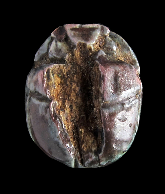 Scarabeo in steatite invetriata turchese; sul ventre si vedono una piuma ed un ureo racchiusi entro un ovale. Il dorso è danneggiato, ma si vedono comunque il clipeo e la divisione di elitre e protorace. Foro passante longitudinale.