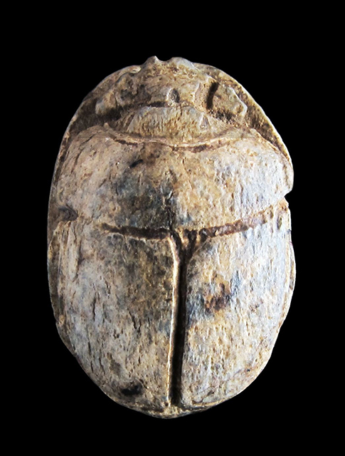 Scarabeo in steatite grigia, con sul ventre incisione di segni geroglifici disposti simmetricamente: si riconoscono due urei con lunga coda ai lati di un vaso hes. Dorso con clipeo ed incisione a T che divide il protorace dalle elitre. Foro passante longitudinale.