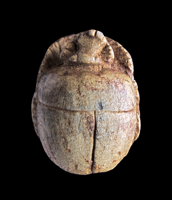 Scarabeo in steatite marrone grigiastra; sul ventre, sotto un segno neb rovesciato si vede un cartiglio col prenome di Thutmosi III in disposizione orizzontale, dal quale pende a sinistra un ureo. Davanti a questo vi sono un segno ankh ed un falco molto stilizzato disposti perpendicolarmente rispetto al resto della decorazione. Dorso con decorazioni sulla testa che contornano l’elaborato clipeo, incisione a T che separa protorace ed elitre. Foro passante longitudinale.