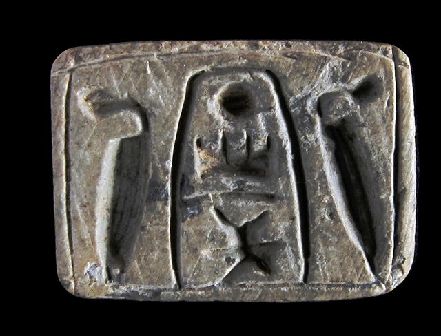 Sigillo in steatite. Su una faccia si vede il cartiglio col prenome di Thutmosi III in disposizione verticale, affiancato da due urei. Sull’altra sono raffigurate a rilievo quattro rane, simbolo di fecondità. Foro passante longitudinale.