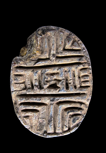Scarabeo in steatite grigio chiaro con sul ventre incisione di motivo geometrico, con la riga centrale che imita i segni geroglifici del prenome di Thutmosi III, con disposizone simmetrica. Dorso con clipeo stilizzato e incisione a T che divide il protorace dalle elitre. Foro passante longitudinale.