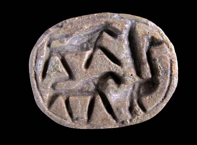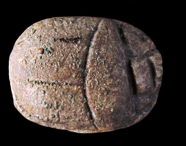 Scarabeo in steatite grigia con, sul ventre, rappresentazione di due leoni sovrapposti e di un’anatra con le ali spiegate. Il dorso è molto stilizzato, con semplice clipeo ed incisione a T che separa protorace ed elitre. Foro passante longitudinale.