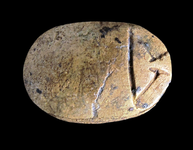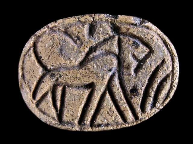 Scarabeo in steatite marrone, con sul ventre incisione che rappresenta leone andante. Dorso molto stilizzato, incisione soltanto del semplice clipeo. Foro passante longitudinale.