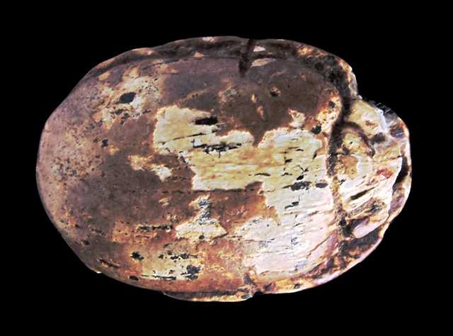 Scarabeo in steatite marrone con sul ventre incisione di un motivo molto simile a quello “a-n-r” in un cartiglio disposto verticalmente, affiancato su ciascun lato da un ugiat e due segni nefer. Dorso con clipeo, elitre e protorace non sono distinti. Foro passante longitudinale.