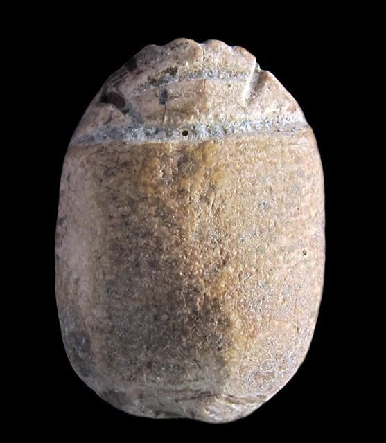 Scarabeo in steatite grigia con sul ventre rappresentazione di un uomo che tiene due coccodrilli per la coda. Dorso con lavorazione del clipeo e incisione a T che separa protorace ed elitre. Foro passante longitudinale.