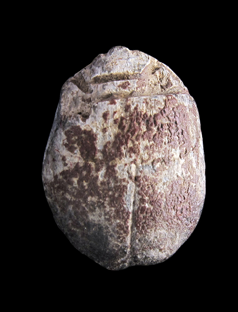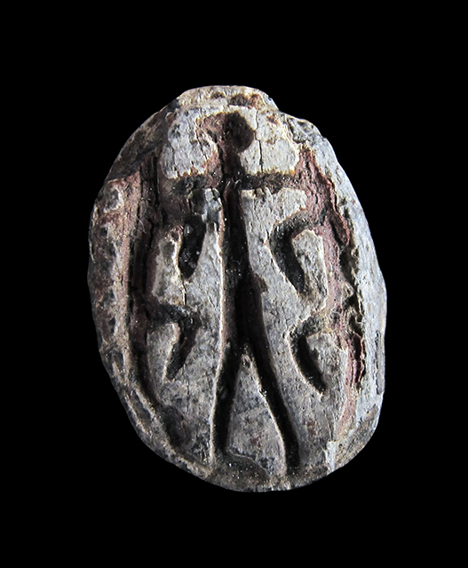 Scarabeo in steatite grigia con sul ventre rappresentazione di un uomo che tiene per la coda due coccodrilli. Sul dorso si vedono il semplice clipeo e le elitre arrotondate sopra lo scutello. Foro passante longitudinale.