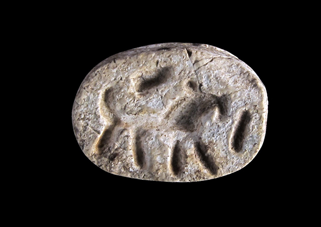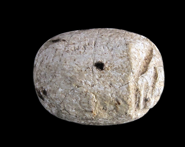 Scarabeo in steatite bianca con sul ventre, immagine di un leone. Dorso che presenta appena visibile l’incisione del clipeo. Foro passante longitudinale.