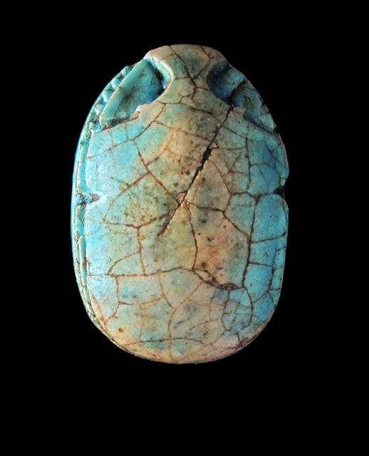 Scarabeo in steatite invetriata azzurra, con sul ventre incisione di motivo vegetale simmetrico. Semplice lavorazione del dorso; sono presenti due incisioni laterali a V all’altezza del protorace. Foro passante longitudinale.
