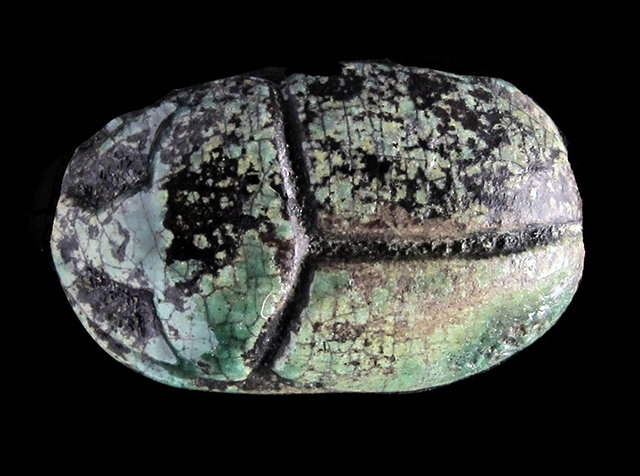 Scarabeo in steatite invetriata verde con sul ventre incisione del nome di Amon-Ra, dietro al quale c’è un segno neb che fa da riempitivo. Dorso con clipeo poco elaborato, protorace ed elitre separati da incisione a Y. Foro passante longitudinale.