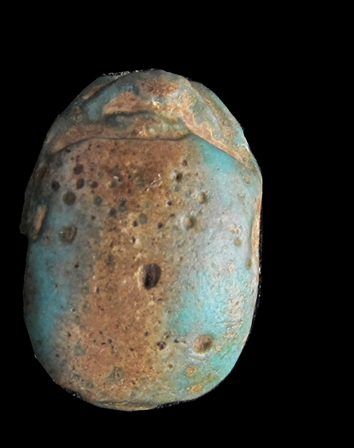 Scarabeo in steatite invetriata turchese con sul ventre incisione che rappresenta un segno ankh davanti al dio Horo in forma di falco con flagello e disco solare sulla testa. Dorso molto semplice con incisione del solo clipeo. Foro passante longitudinale.