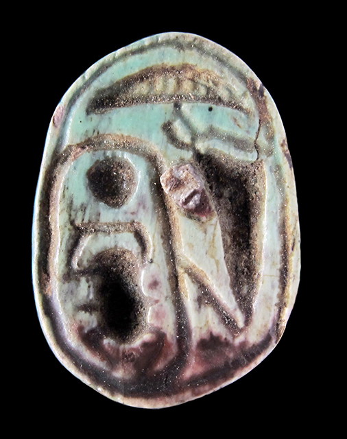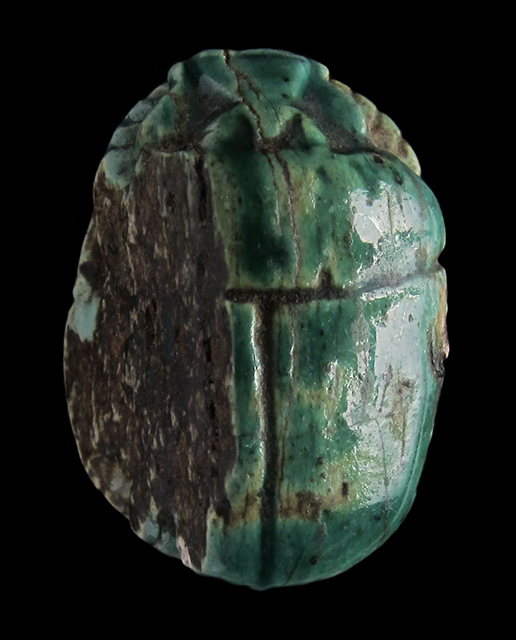 Scarabeo in steatite invetriata turchese; sul ventre, sotto un segno neb capovolto si vedono a sinistra il cartiglio col prenome di Thutmosi III e a destra un ureo. Dorso con una scheggiatura sulla parte sinistra, rimangono visibili le incisioni del clipeo e delle elitre. Foro passante longitudinale