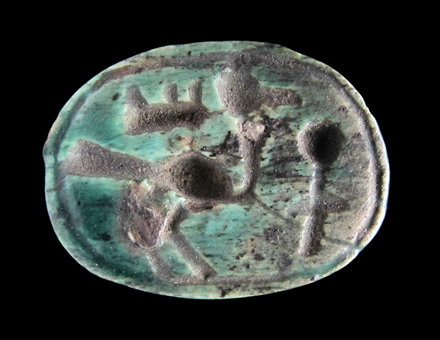 Scarabeo in steatite invetriata turchese con sul ventre incisione crittografica del nome di Amon-Ra. Sul dorso si intravedono le incisioni di clipeo, protorace ed elitre. Foro passante longitudinale.
