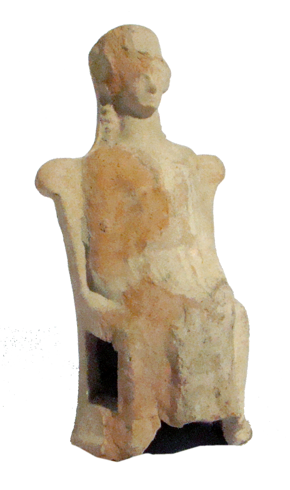 Figura femminile in terracotta, realizzata a matrice. Retro non lavorato. Cavità rettangolare sul retro. Visile la scritta in rosso "631". Apposta un'etichetta recante la cifra "631" e un'altra etichetta ovale con la dicitura "28 Febbr. 74 Baldini GRECIA", applicata su una precedente etichetta rettangolare. Figura femminile assisa su trono.. Indossa un lungo chitone parzialmente visibile. Testa piccola su collo lungo. Non è visibile la capigliatura, indossa un polos cilindrico e ai due lati del collo scendono trecce di capelli. Le braccia sono poste sulle ginocchia.