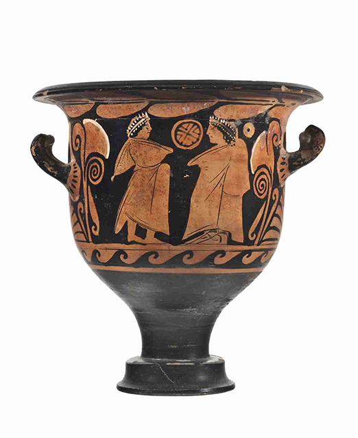 L'imboccatura del vaso è ampia, con orlo estroflesso segnato da una leggerissima modanatura concava; il corpo è campaniforme e, con un corto stelo, poggia su un piede modanato, con profilo a cavetto e listello alla base. Le anse a bastoncello sono impostate orizzontalmente a metà della vasca e incurvate verso l'alto. La vernice nera è uniforme, opaca, e copre interamente anche l'interno della vasca, risparmiando però due filetti all'interno e una fascia sotto l'orlo; dettagli, anche piuttosto estesi, sono sovradipinti con vernice bianca o gialla. Il colore dell'argilla oscilla tra Munsell 5YR 6/6 (reddish yellow), 2.5YR 5/8 (red) e 10R 5/8 (red). Il lato A è dominato dalla figura di un cavaliere: la figura si estende fino al di sopra dei motivi accessori sull'orlo, ai lati e oltre la doppia linea nera che fa da base alla scena. Cavallo e cavaliere sono di profilo, al galoppo verso sini-stra; il giovane, nell'atto di tenere le redini del cavallo, porta sul capo, dai corti capelli, una corona radiata decorata con una fila di perle e indossa orecchini rotondi, il tutto sovradipinto in bianco-giallo. Indossa una tu-nica italica a maniche corte cinta in vita da un cinturone, anch'esso reso in bianco, e porta un mantello fissato sul petto con una fibula, che svolazza alle sue spalle per la velocità del movimento; le calzature sono appuntite. Il cavallo è al galoppo, con le zampe anteriori sollevate, la destra leggermente più in alto; le zampe posteriori, pur di profilo, sono visibili entrambe. L'animale è ben caratterizzato con numerosi dettagli sovradipinti in bianco: la folta criniera, una striscia sul muso, le redini, la parte bassa delle zampe e la coda, ma è privo di qualunque tipo di sella. La scena è completata dal dettaglio paesaggistico del terreno, presente solo tra le zampe del cavallo e non facente da appoggio, reso con una linea ondulata bianca a limitare un'area risparmiata riempita con pallini bianchi e neri; spunta una coppia di elementi vegetali, con due foglie arricciate e un fiore a spiga, inclinati verso destra, come sospinti dal vento. Sul lato B, due giovani ammantati affrontati. Quello a sinistra è più slanciato, di profilo verso destra, con un piede leggermente avanzato; porta sul capo una corona a corti raggi decorata con perline ed è completamente coperto dal mantello, sorretto, parrebbe, dal braccio sinistro e con un lembo che ricade dietro la schiena. Le calzature a punta sono del tutto prive di dettagli. L'altro ha una forma più tozza, perfettamente di profilo verso sinistra, con la medesima corona radiata e i corti riccioli che scendono sulle spalle. L'himation lo copre completamente ma è drappeggiato in maniera più semplice rispetto a quello dell'altro personaggio; le scarpe sono invece dettagliate. In alto, tra le due teste, una palla, riempita da una croce di S. Andrea inscritta in un cerchio, con triangoli tra i bracci; a destra, dietro la nuca del giovane a destra, un altro riempitivo circolare, con un punto nero nel mezzo. I motivi decorativi accessori comprendono un tralcio di alloro sinistrorso sull'orlo e un fregio ad onde marine de-strorse inquadrato da due filetti risparmiati al di sotto della decorazione figurata principale. Alla base delle anse, dietro le quali il corpo del vaso è a risparmio, un motivo a baccellatura, molto corsivo; al di sotto delle anse, una palmetta, molto schematica, con ai lati fiori a campanula con l'orlo sovradipinto in bianco e girali. Sul piede, in corrispondenza del lato A, è presente ciò che resta di una vecchia etichetta: '85', mentre l'attuale numero di Inventario Generale è tracciato a inchiostro rosso all'interno dell'orlo.