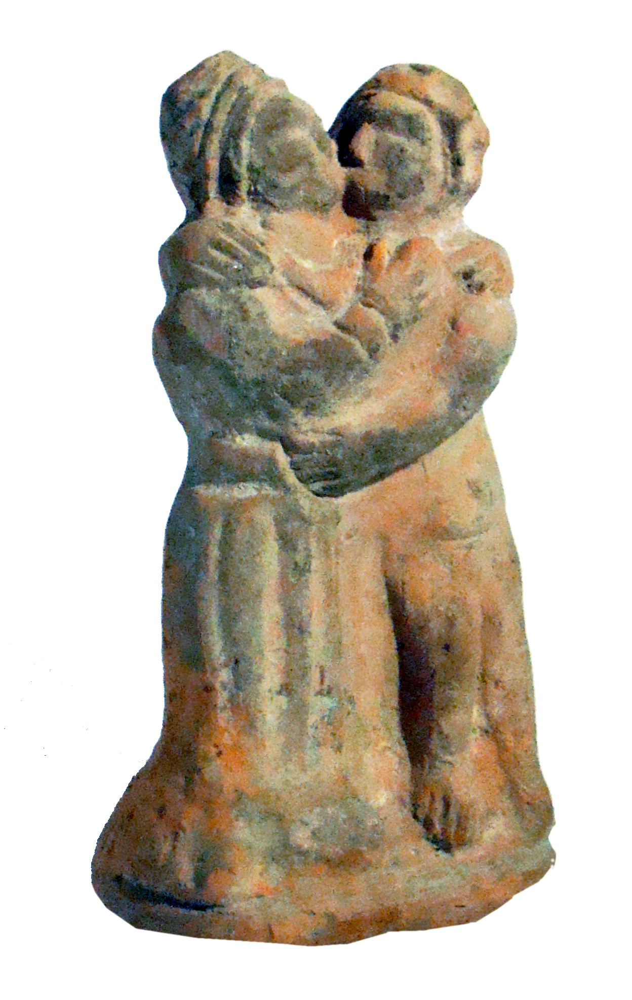 Gruppo statuario in terracotta, realizzato a matrice. Cava all'interno. Sul retro l'etichetta "626" e la scritta in rosso "5109". Retro non rifinito. Figura maschile e femminile abbracciate, raffigurate nell'atto di scambiarsi un bacio. La figura femminile presenta un'alta acconciatura; i particolari del volto non sono evidenti, ad eccezione dell'arcata sopracciliare pronunciata, del setto nasale e dello zigomo destro. Vestita di una lunga tunica con pieghe sul davanti, cintura e polsino sulla manica. Le dita sono ben disegnate. La figura maschile è nuda: segnati con due trattini le pieghe delle ginocchia, delle caviglie e della pancia, indicati l'ombelico e il pube. La capigliatura è riccia, appena accennata con delle infossature.