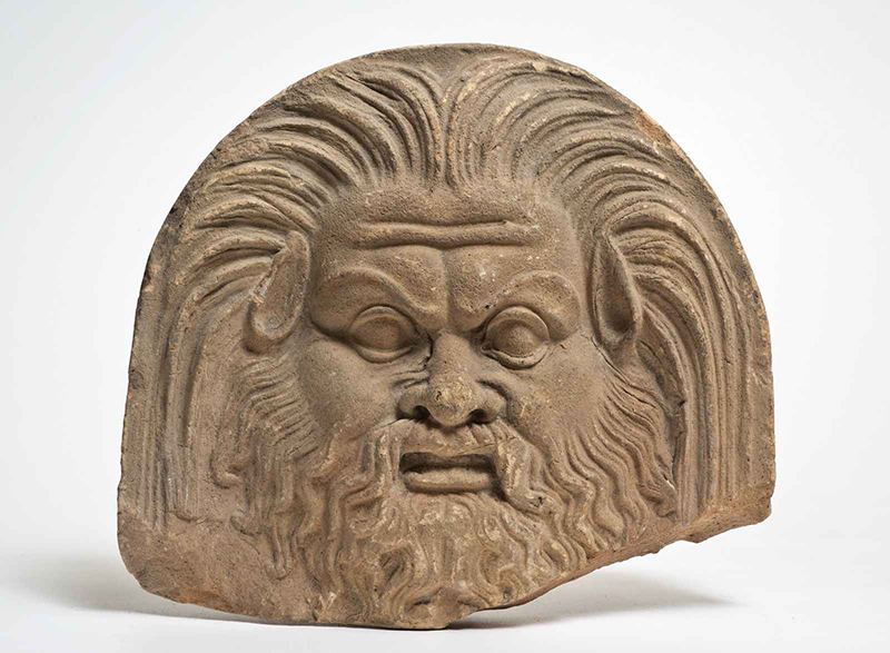 Argilla di colore rossastro, in frattura di color rosato. La bocca, dalle labbra carnose, è aperta, gli occhi ben spalancati, il naso decisamente largo e schiacciato, le sopracciglia corrugate e ben sollevate, la fronte solcata da due profonde rughe orizzontali; le orecchie equine sono poste all'altezza degli occhi, lunghe ciocche di capelli ai lati del viso, la barba è folta.