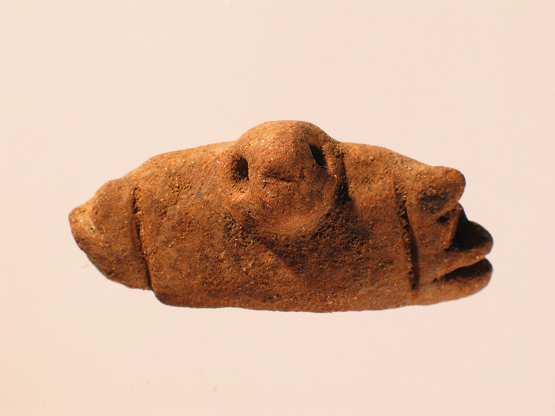 Piccolo copricapo di stile Usulután modellato con impasto di argilla. Il frammento apparteneva probabilmente ad una figurina antropomorfa. La fattura non è particolarmente accurata, tuttavia la forma del copricapo è perfettamente riconoscibile. Si tratta del tipo rettangolare con frange e testina di uccello in rilievo nella parte anteriore, frequente nelle figurine Usulután. Le frange laterali, che probabilmente rappresentano piume di uccello, sono rese con linee incise e scanalature parallele. Le fattezze della protome centrale sono appena abbozzate: muso appuntito e, ai lati, due fori per gli occhi.