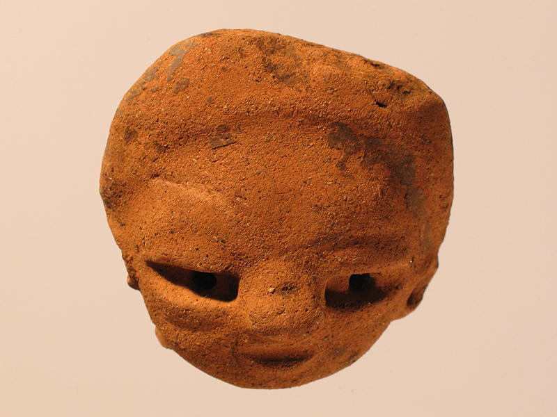 Piccola raffigurazione in terracotta, di stile Usulután, di una testa umana. La base sotto al collo è irregolare. Il viso è privo di espressione secondo una modalità tipica di tale produzione fittile. Gli occhi sono ottenuti con due fessure orizzontali forate al centro. Naso e labbra sono in rilievo. Il personaggio sembra indossare un copricapo a turbante ricavato da una fascia che avvolge la testa, cingendo fronte e nuca. Le orejeras circolari e la fronte appiattita alludono probabilmente al rango o al ruolo sociale. Sono ancora presenti tracce di ingobbio scuro sulla superficie.