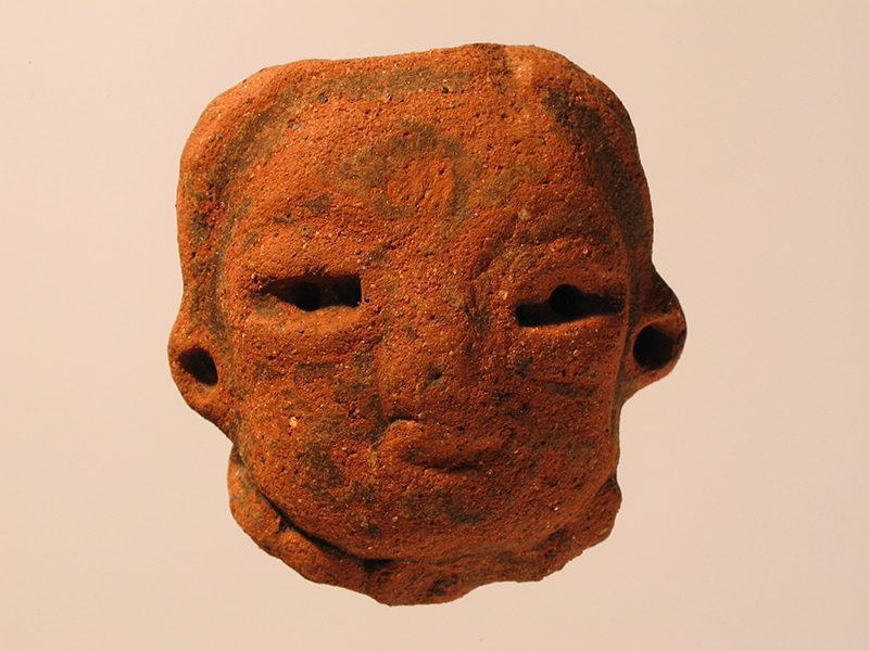Testa umana di stile Usulután modellata con impasto di argilla rossa. I tratti somatici non emergono, o sono poco pronunciati, come se si trattasse di un oggetto non finito. Elementi salienti sono gli orecchini circolari, importanti indicatori di status, e la collana con grosse perle ovali intorno al collo. Sulla testa si nota un copricapo a fascia che avvolge la fronte e gira intorno alla nuca. La superficie rivela tracce di ingobbio o pittura scura.