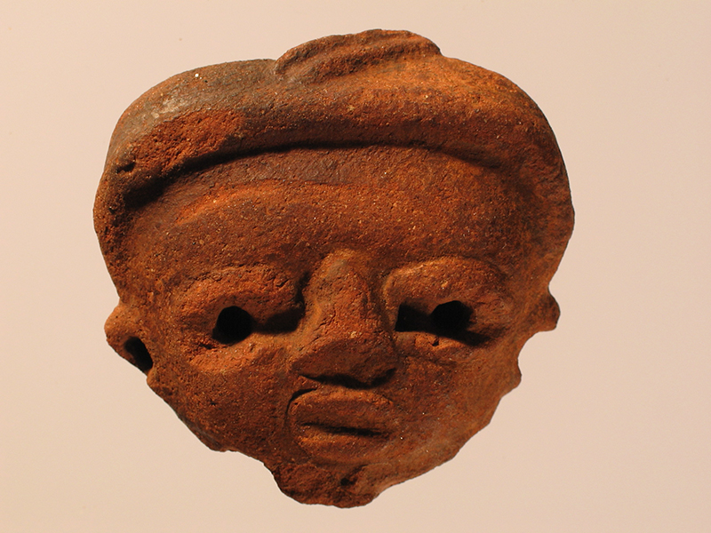 Testa umana di stile Usulután ritratta con pochi elementi essenziali e gli ornamenti caratteristici del rango: orecchini circolari, copricapo e collana. Quest’ultima era costituita da grosse perle sferiche applicate intorno al collo e oggi assenti. La bocca ha la forma di un chicco di caffè mentre gli occhi mostrano l’iride perforato. Il copricapo consiste in una sorta di fascia sormontata da un elemento in rilievo posto di traverso. Un altro simile, con tre scanalature dipinte in bianco, è applicato sulla nuca. L’ingobbiatura è in parte annerita. L’interno è cavo e presenta due fori sopra le orecchie.