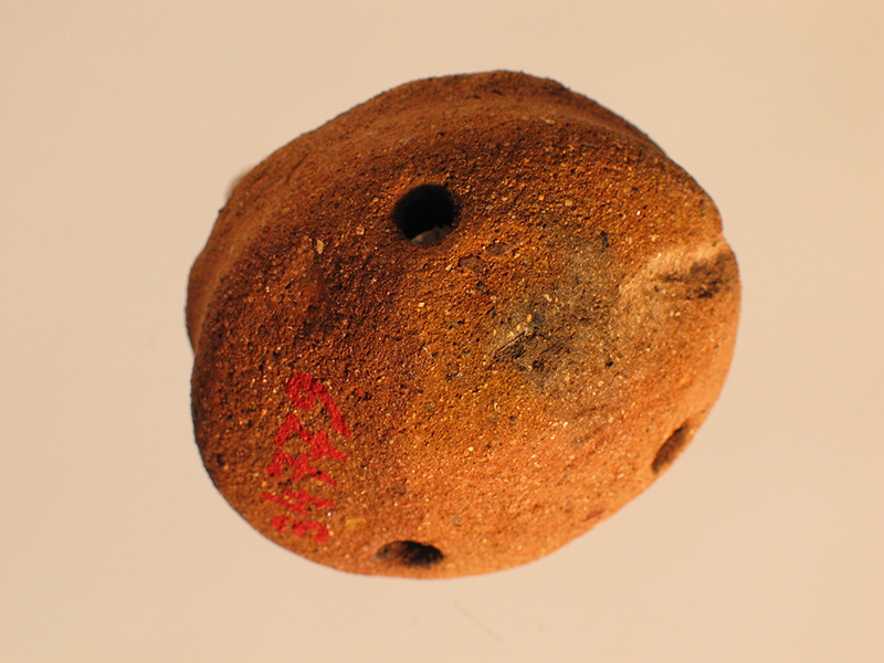 Piccola calotta emisferica di stile Usulután di terracotta, ottenuta con un impasto di argilla rossa mista a materiale sgrassante. La superficie appare ruvida e priva di ingobbiatura. L’interno è cavo e la base aperta. È difficile stabilire con esattezza la funzione dell’oggetto. Potrebbe trattarsi di un’applique, di un piede di vaso o di un sonaglio privo del fondo. Nella parte superiore tre fori. La superficie presenta una scheggiatura e una bruciatura.