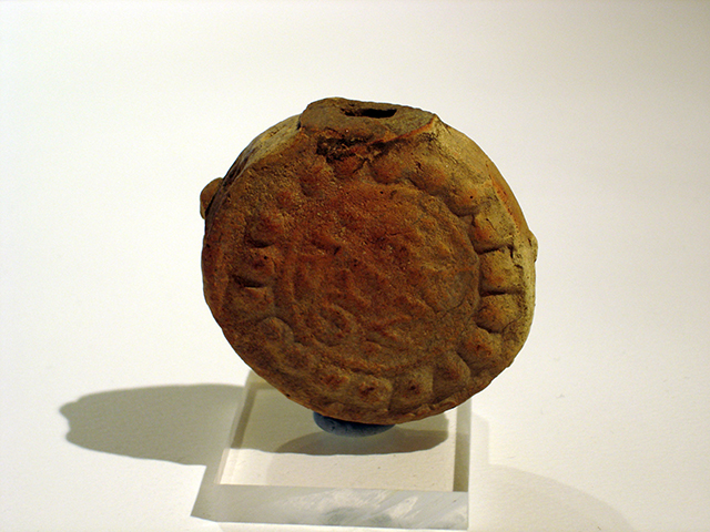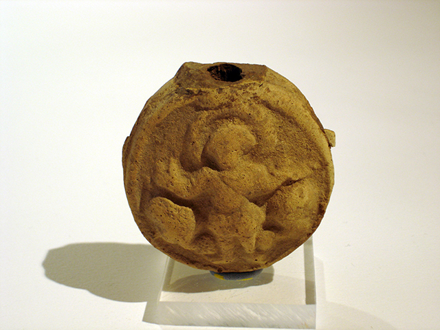 Ampolla piatta in argilla nocciola rosata, priva delle anse e del collo, ottenuta da matrice abbastanza fresca. Sul lato A, entro un disco piano sprovvisto di cornice, San Menas, con la testa circondata da un nimbo, è raffigurato in atteggiamento da orante, tra due cammelli che occupano per intero lo spazio a disposizione. Sul lato B, entro una cornice a globetti che circoscrive un anello appena rilevato, l’iscrizione su tre righe AΓI | OYMH | NA, che sta per “(eulogia) di San Menas”.