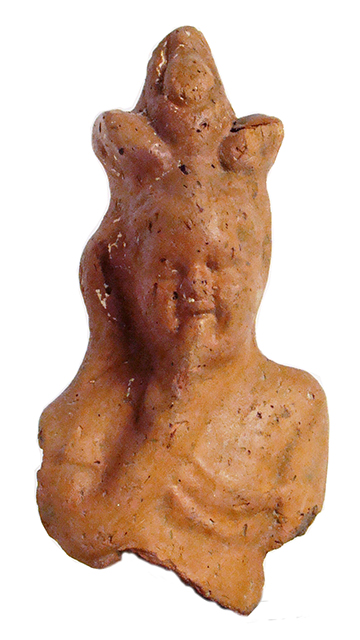 Le statuina, modellata in stampo dall’interno cavo, conserva tracce di ingobbiatura, ma è spezzata all'altezza del busto. Raffigura il dio Arpocrate, che con il braccio destro piegato porta il dito indice alla bocca; con il sinistro probabilmente sorreggeva, poggiandola alla spalla e al fianco, una cornucopia. A destra del volto si intuisce la treccia caratteristica dell’età infantile e sul capo la corona pscent affiancata dai due boccioli di loto. Sul retro presenta un’altra treccia resa a incisioni che descrivono un andamento “a spina di pesce”.