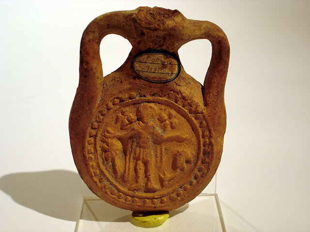 Ampolla piatta in argilla nocciola rosata con tracce di ingobbiatura di colore scuro e priva del collo; ottenuta da matrice abbastanza fresca. Su entrambi i lati dell’ampolla, entro una cornice di perline rilevate tra due anelli, vi è la medesima scena: il santo è raffigurato al centro, in posizione di orante, tra due cammelli (di dimensioni diverse). Sul lato A, attorno al capo del santo vi sono due croci greche a globetti, di cui quella a sinistra è più piccola; sul lato B le due croci sono a forma di piccolo fiore a quattro petali. Il livello di dettaglio delle incisioni è notevole.